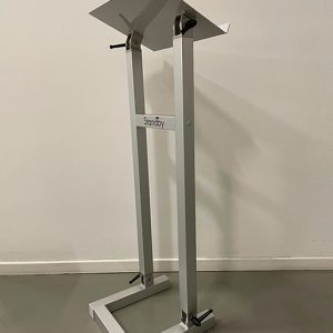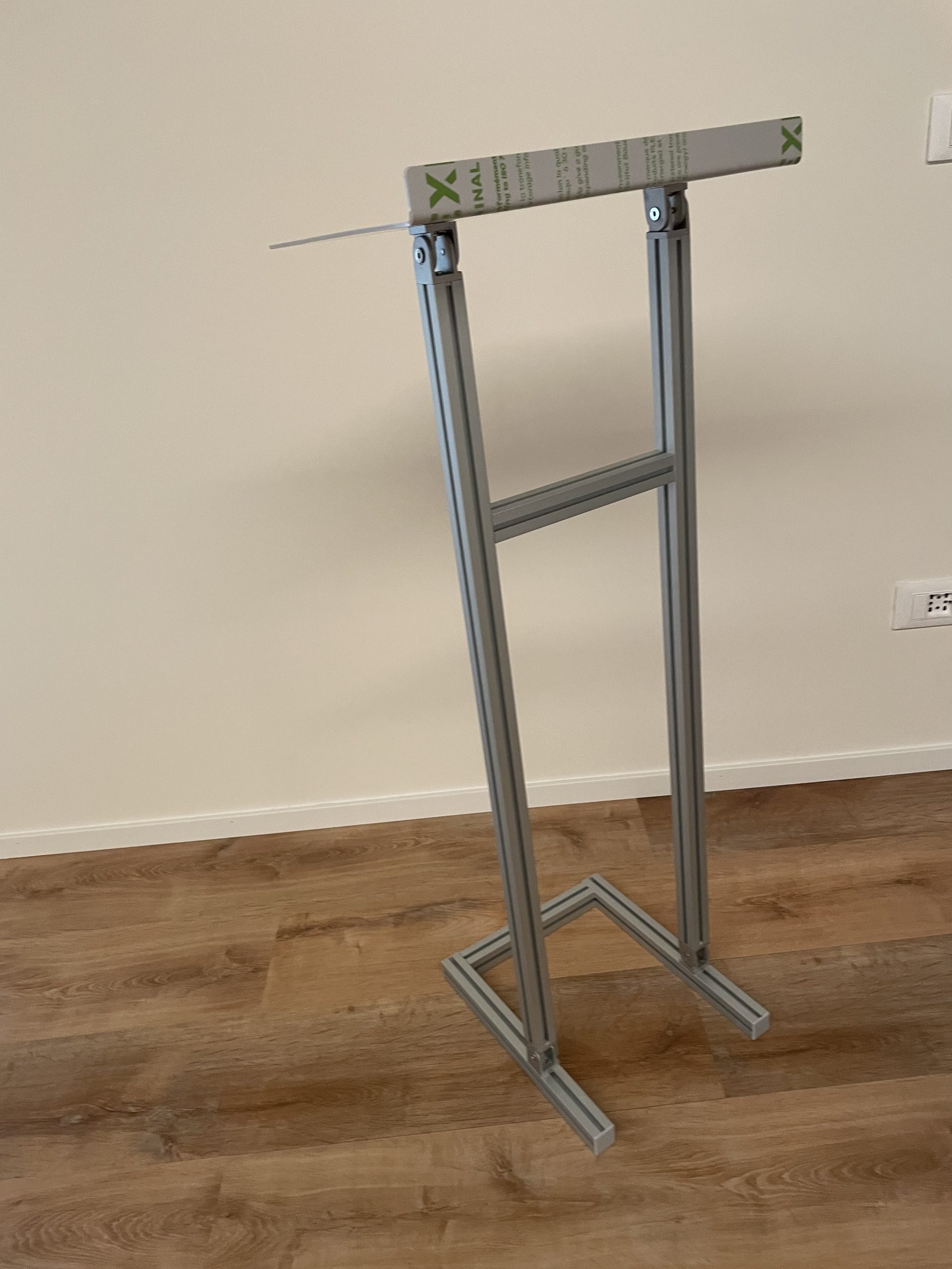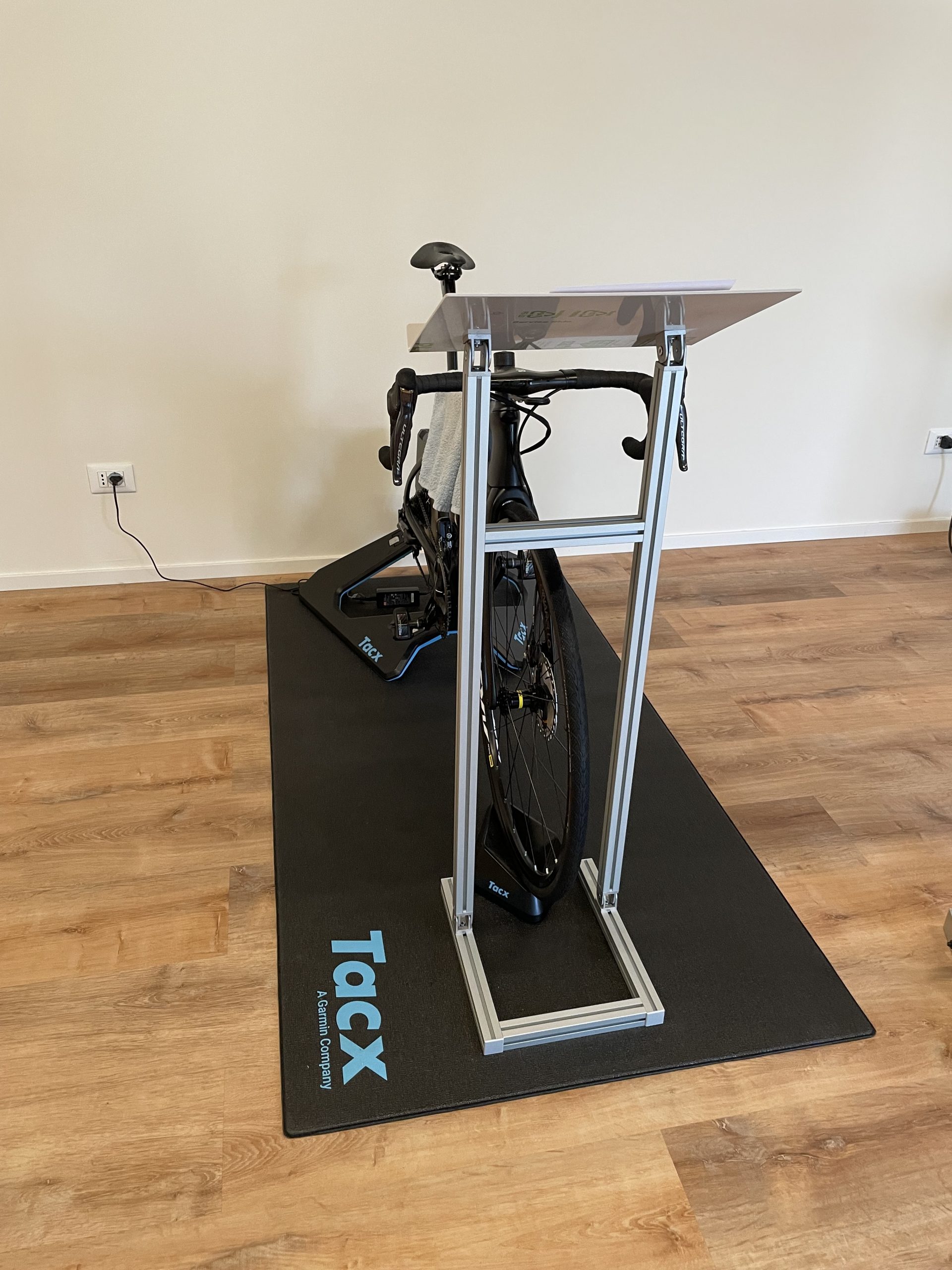 Struttura in alluminio leggero con supporto in policarbonato piegato a caldo, realizzato per sostenere notebook, tablet, smartphone e altri strumenti necessari per gli allenamenti bike indoor.